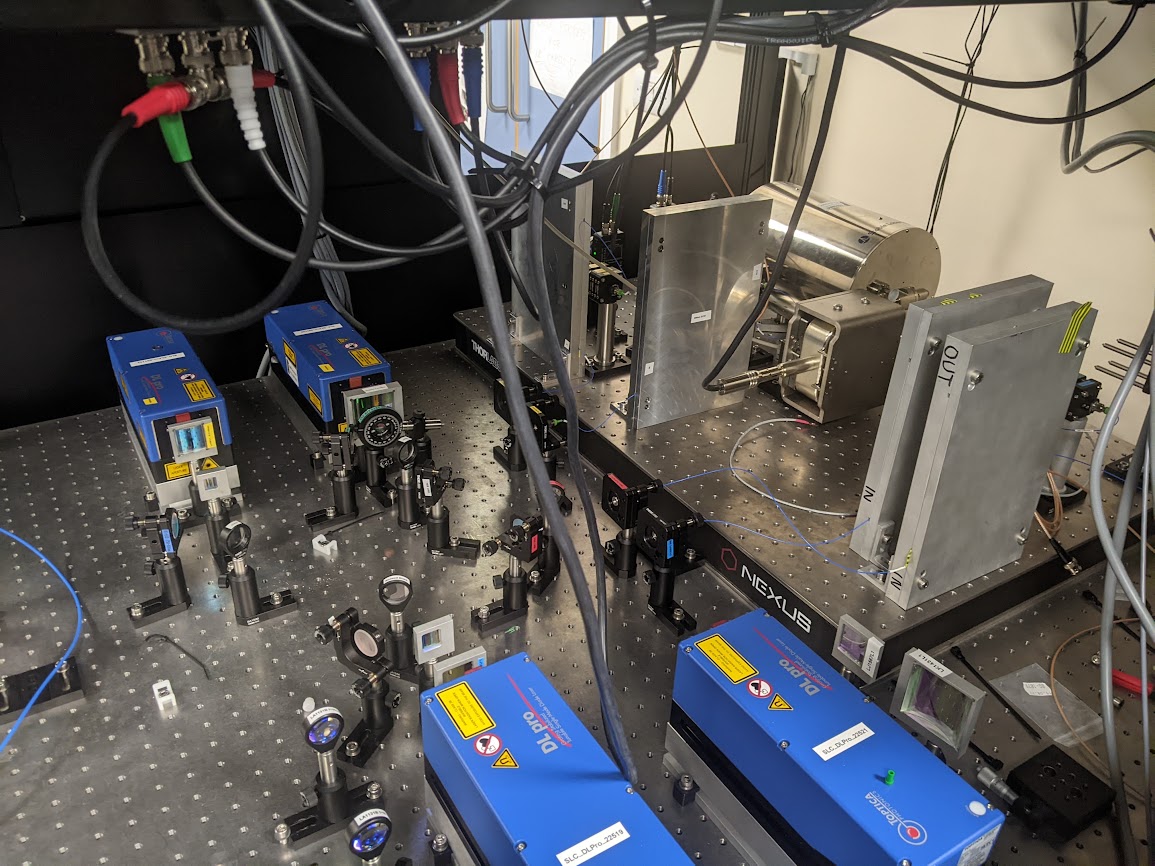 STIRAP lasers. These lasers are be used to tranfer molecules between a weakly bound state and the absolute ground state using a coherent process which keeps the molecules cold. As they address transitions in the bi-alkali molecule we use a high finesse cavity under vaccum (metal cylinder in top right) as a frequency refernce.